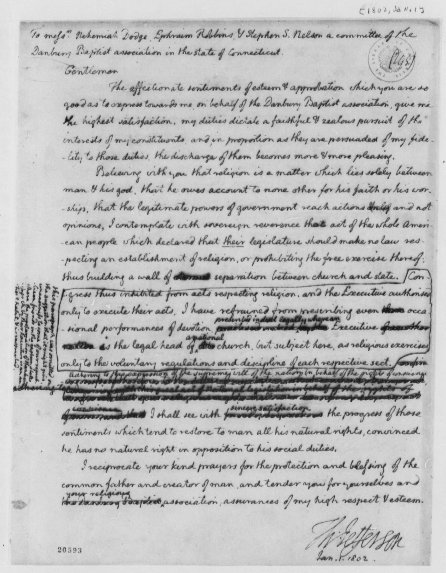 Brown: Really for 50 years. Here we have an instance where Jefferson wrote the Danbury letter on his own. It was private correspondence, and then wasn’t revealed until later, until his papers were collected. But it seems to me that it’s very different from the constitutional debates where you actually had deliberation over specific language. You had other people reading over your shoulder, checking drafts, making sure that language was precise.